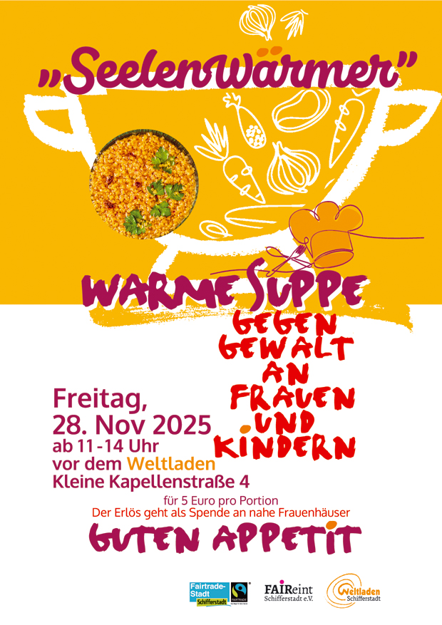 Am 28.11. sammelt der Weltladen und die Fairtrade Stadt mit dem Ausschank einer wärmenden Suppe zur Mittagszeit ab 11:30 Uhr Spenden für das Frauenhaus. Bezugnehmend auf den „Tag gegen Gewalt an Frauen und Kindern” möchte das Team die Kundinnen und Kunden mit einer Suppe als „Seelenwärmer” erfreuen. Die Spende von rund 5 Euro pro Teller wird in voller Höhe an das Frauenhaus weitergegeben.
